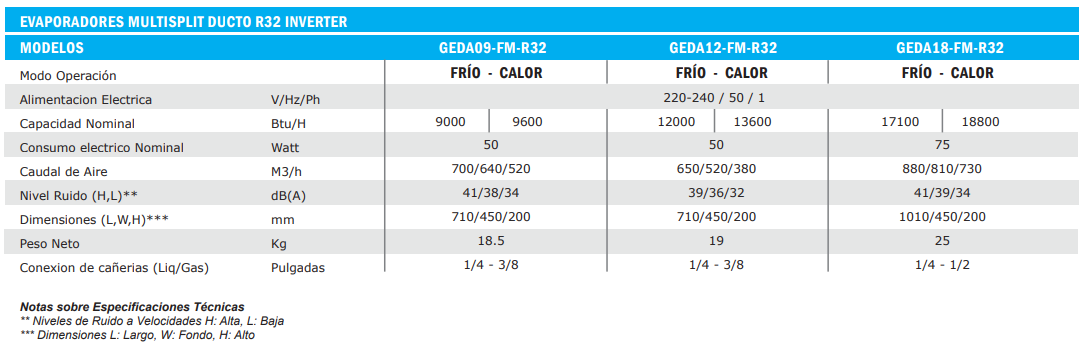 Unidad Evaporadora Ducto Baja Silueta, Capacidad de Frío 9000 BTUH del Tipo INVERTER R32. Alimentacion Monofasica 220V/50HZ. Incluye Kit de Cañeria de 5 mt. y controles remoto Inalambrico y alambrico.