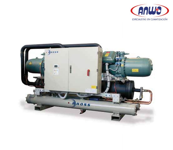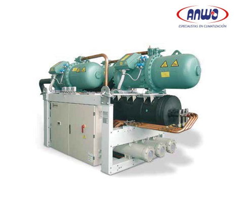 • Compresor: semihermético de tornillo de alta eficiencia energética, con arranque part-winding o estrella-triángulo (en función de los modelos) limitado; incluye protección integral, calentador del cárter y llave de paso en la tubería de impulsión del gas refrigerante.
