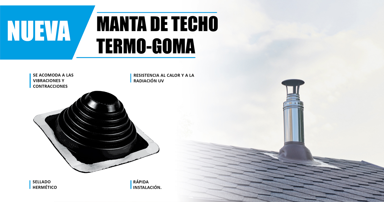 Las Mantas de techo termo-goma están fabricados con una base de plástico plegable 100% flexibles y rígidas, para aplicaciones comerciales y residenciales que requieren un sello hermético para las tuberías de ventilación. Son fácil de instalar sin herramientas especiales y ahorra tiempo y mano de obra.