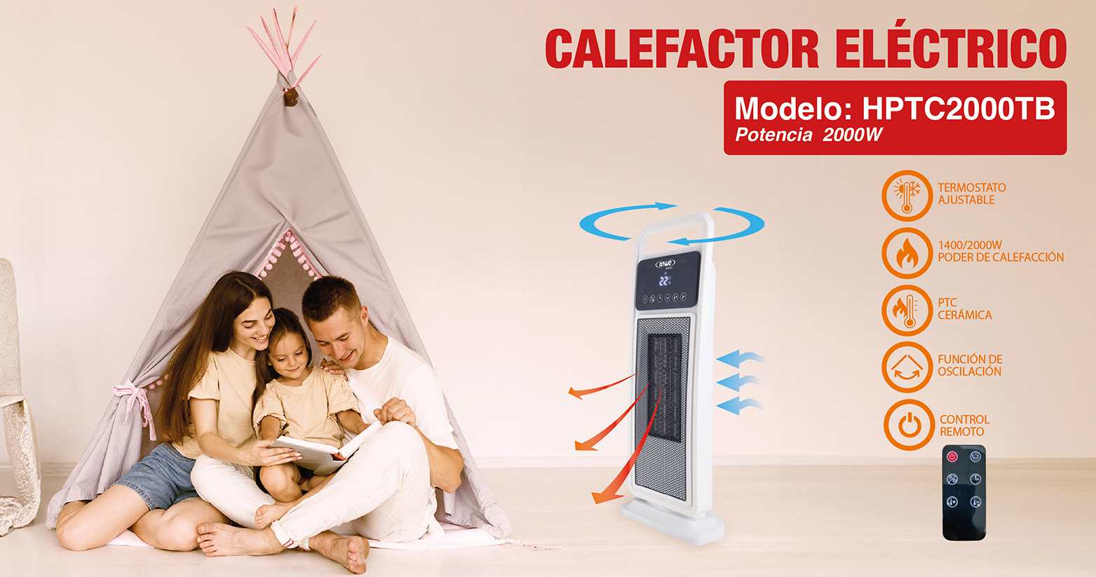 Cuenta con dos niveles de potencia bajo y alto (1400W / 2000W), control remoto y pantalla LED. Flujo de aire forzado con función de oscilación