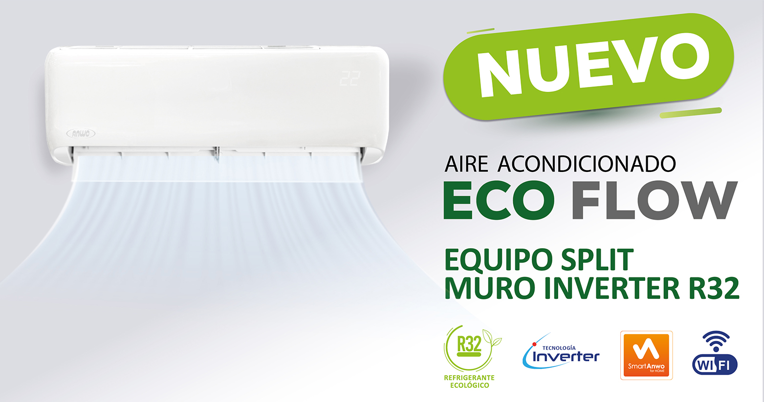 Como complemento de la Linea de equipos Split Muro INVERTER, Anwo presenta su nuevo modelo ECOFLOW Split Muro Frio/Calor INVERTER R32.