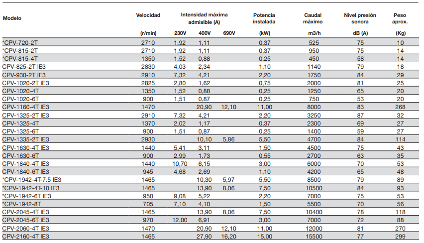 • Motor eficiencia IE3 para potencias superiores a 0.75kW excepto 220V, de 2 velocidades y 8 polos